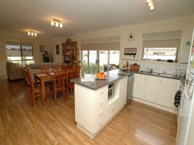 The chef's kitchen has all the mod cons with stainless steel dishwasher, lazy Susan, gas cook top and oven, pantry and more than ample bench space. The kitchen/dining and lounge area are all open plan. A sliding door from the dining room leads you to the alfresco undercover area which is on the north side of the home.