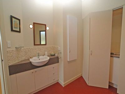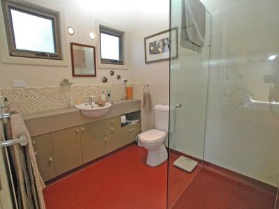 The master bedroom enjoys the early morning sun and links to a delightful ensuite bathroom and large walk in robe & dressing room concealed behind the bed head wall. The guest bathroom also accommodates a hidden laundry behind a discrete panel of bi fold doors maximising best use of floor space.
