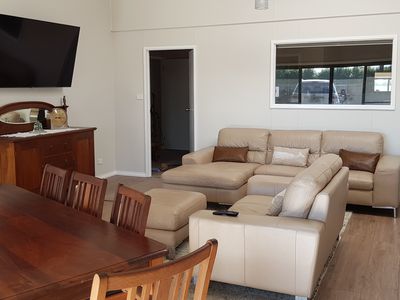 Two separate living areas, both with RC air conditioners, main living room with two super comfortable leather lounges, and a gigantic LG Smart TV, kitchen with large fridge, dishwasher, microwave and oven, 8 seater dining table, 3 bedrooms all with queen beds, bathroom with large walk-in shower, laundry area with washing machine, off street parking for 4 cars (boat/trailer parking available) , undercover BBQ area, fire pit on request.